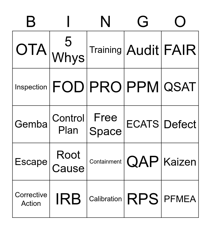 This bingo card has a free space and 24 words: Root Cause, IRB, PRO, Corrective Action, FAIR, OTA, Inspection, 5 Whys, ECATS, Containment, PPM, Gemba, QAP, Kaizen, FOD, RPS, Defect, Training, QSAT, Control Plan, PFMEA, Escape, Audit and Calibration.