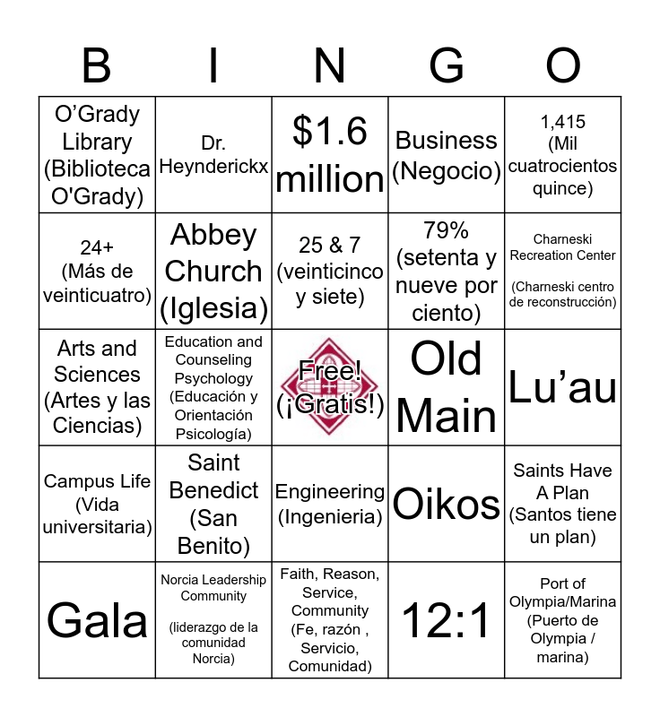 This bingo card has a free space and 24 words: Saint Benedict (San Benito), Norcia Leadership Community (liderazgo de la comunidad Norcia), 25 & 7 (veinticinco y siete), Gala, 1,415 (Mil cuatrocientos quince), O’Grady Library (Biblioteca O'Grady), 24+ (Más de veinticuatro), Dr. Heynderickx, Old Main, Engineering (Ingenieria), 79% (setenta y nueve por ciento), Arts and Sciences (Artes y las Ciencias), Oikos, Saints Have A Plan (Santos tiene un plan), Abbey Church (Iglesia), 12:1, Lu’au, $1.6 million, Charneski Recreation Center (Charneski centro de reconstrucción), Education and Counseling Psychology (Educación y Orientación Psicología), Port of Olympia/Marina (Puerto de Olympia / marina), Campus Life (Vida universitaria), Business (Negocio) and Faith, Reason, Service, Community (Fe, razón , Servicio, Comunidad).