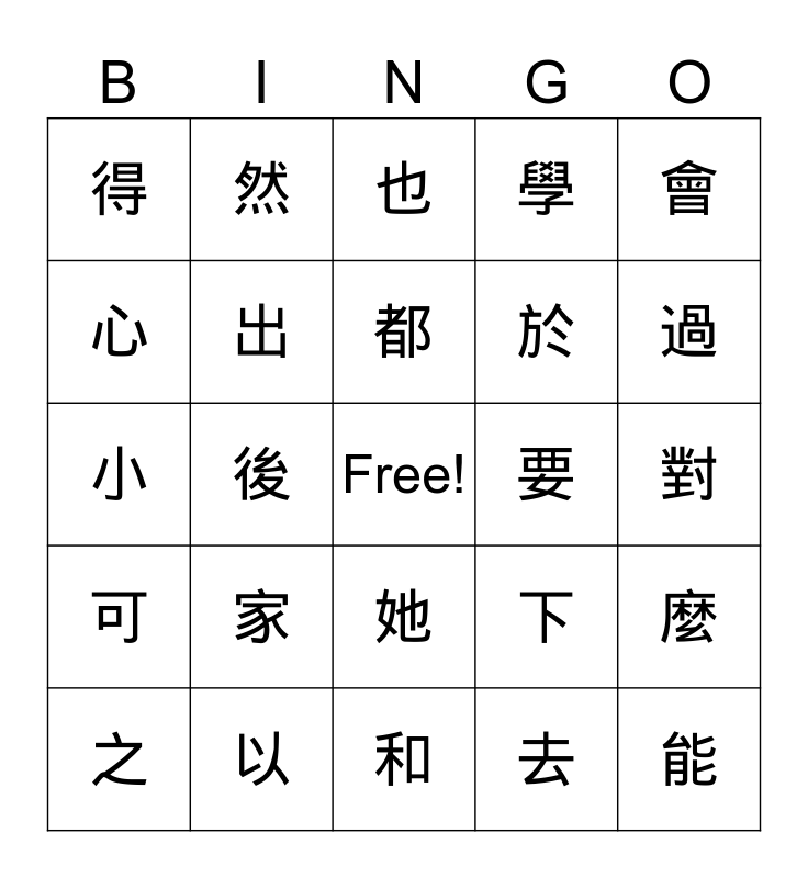 This bingo card has a free space and 30 words: 以, 自, 後, 裡, 得, 也, 出, 她, 要, 和, 對, 能, 去, 天, 過, 而, 下, 可, 家, 會, 小, 多, 然, 於, 心, 學, 麼, 之, 都 and 好.