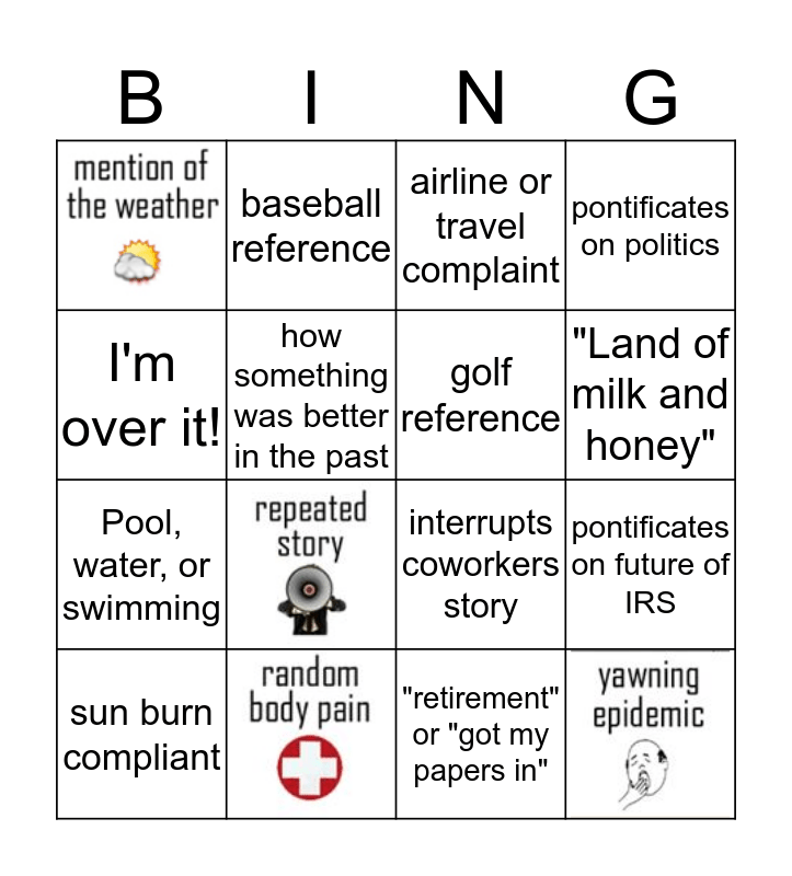 This bingo card has 4 images and 12 words: pontificates on future of IRS, airline or travel complaint, Pool, water, or swimming, baseball reference, interrupts coworkers story, "retirement" or "got my papers in", I'm over it!, how something was better in the past, sun burn compliant, pontificates on politics, "Land of milk and honey" and golf reference.