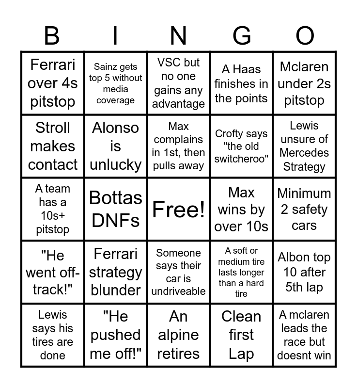This bingo card has a free space and 25 words: Ferrari strategy blunder, An alpine retires, Max complains in 1st, then pulls away, Lewis says his tires are done, Mclaren under 2s pitstop, Ferrari over 4s pitstop, Stroll makes contact, Sainz gets top 5 without media coverage, Max wins by over 10s, Someone says their car is undriveable, Crofty says "the old switcheroo", A team has a 10s+ pitstop, A soft or medium tire lasts longer than a hard tire, Albon top 10 after 5th lap, Alonso is unlucky, Perez finishes outside top 4 "is done", Minimum 2 safety cars, VSC but no one gains any advantage, Lewis unsure of Mercedes Strategy, Bottas DNFs, A mclaren leads the race but doesnt win, "He pushed me off!", "He went off-track!", A Haas finishes in the points and Clean first Lap.