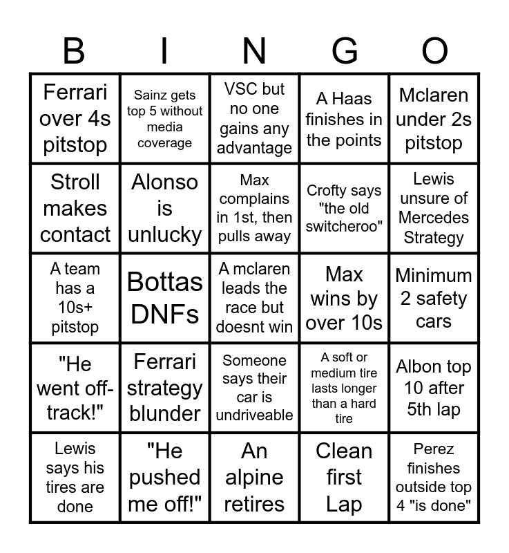 This bingo card has 25 words: Ferrari strategy blunder, An alpine retires, Max complains in 1st, then pulls away, Lewis says his tires are done, Mclaren under 2s pitstop, Ferrari over 4s pitstop, Stroll makes contact, Sainz gets top 5 without media coverage, Max wins by over 10s, Someone says their car is undriveable, Crofty says "the old switcheroo", A team has a 10s+ pitstop, A soft or medium tire lasts longer than a hard tire, Albon top 10 after 5th lap, Alonso is unlucky, Perez finishes outside top 4 "is done", Minimum 2 safety cars, VSC but no one gains any advantage, Lewis unsure of Mercedes Strategy, Bottas DNFs, A mclaren leads the race but doesnt win, "He pushed me off!", "He went off-track!", A Haas finishes in the points and Clean first Lap.