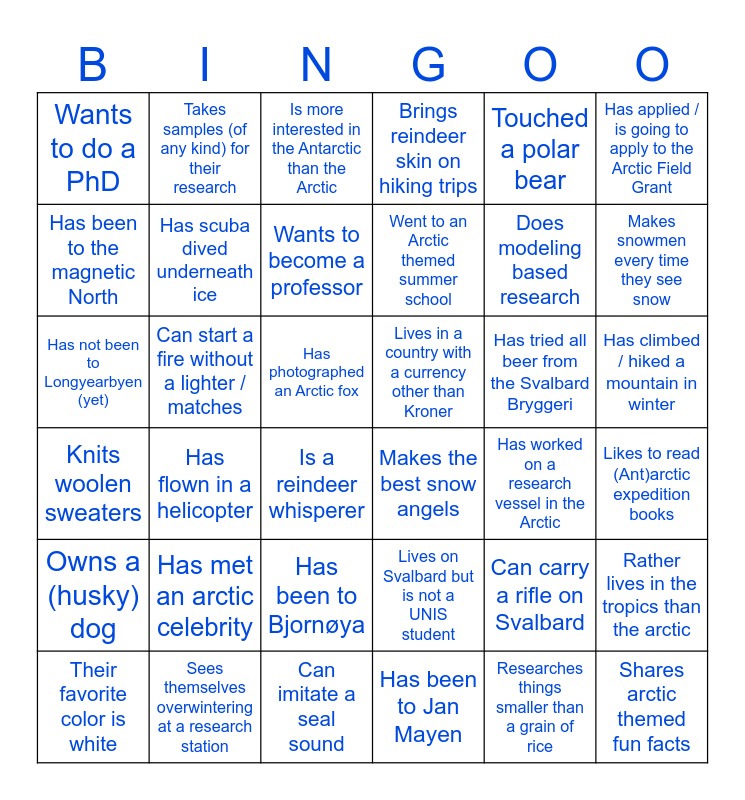 This bingo card has 36 words: Lives on Svalbard but is not a UNIS student, Has been to Bjornøya, Has been to Jan Mayen, Has been to the magnetic North, Knits woolen sweaters, Lives in a country with a currency other than Kroner, Has scuba dived underneath ice, Can imitate a seal sound, Touched a polar bear, Can carry a rifle on Svalbard, Makes snowmen every time they see snow, Brings reindeer skin on hiking trips, Rather lives in the tropics than the arctic, Can start a fire without a lighter / matches, Went to an Arctic themed summer school, Wants to do a PhD, Owns a (husky) dog, Has tried all beer from the Svalbard Bryggeri, Has not been to Longyearbyen (yet), Is more interested in the Antarctic than the Arctic, Has photographed an Arctic fox, Has flown in a helicopter, Makes the best snow angels, Is a reindeer whisperer, Has worked on a research vessel in the Arctic, Takes samples (of any kind) for their research, Does modeling based research, Sees themselves overwintering at a research station, Wants to become a professor, Has applied / is going to apply to the Arctic Field Grant, Shares arctic themed fun facts, Their favorite color is white, Likes to read (Ant)arctic expedition books, Has climbed / hiked a mountain in winter, Has met an arctic celebrity and Researches things smaller than a grain of rice.