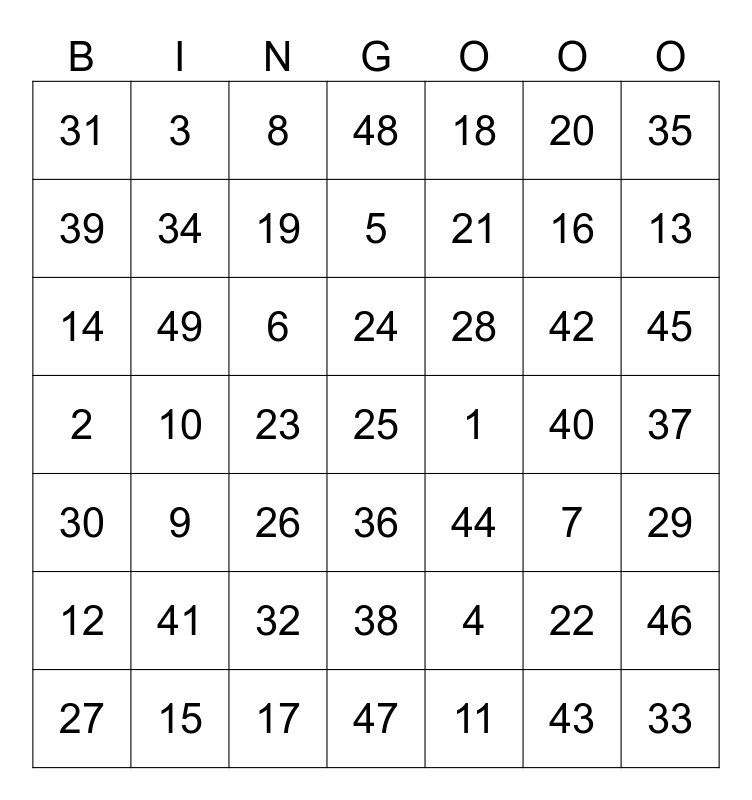 This bingo card has a free space and 48 words: 4, 16, 47, 10, 6, 37, 3, 15, 20, 36, 35, 48, 42, 28, 12, 40, 39, 13, 22, 18, 21, 23, 31, 34, 46, 19, 45, 27, 24, 49, 43, 1, 29, 41, 2, 44, 7, 14, 26, 32, 30, 33, 8, 17, 5, 38, 9 and 11.