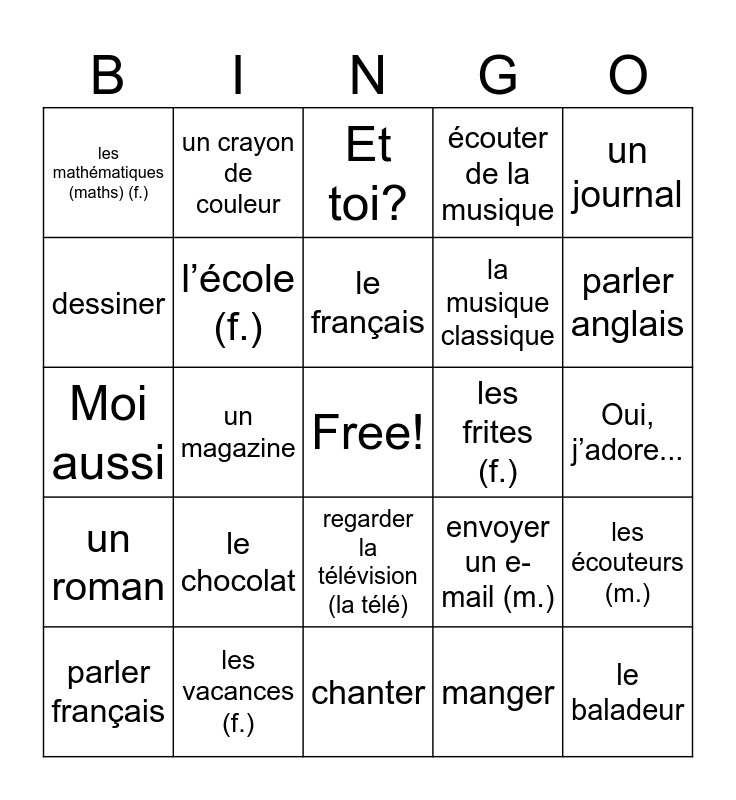 This bingo card has a free space and 49 words: L’anglais (m.), le baladeur, une bande dessinée (une BD), chanter, le chocolat, un crayon, un crayon de couleur, un dessin, dessiner, dormir, l’école (f.), écouter de la musique, les écouteurs (m.), envoyer un e-mail (m.), étudier, lire, le français, les frites (f.), la glace, un journal, un magazine, manger, les mathématiques (maths) (f.), la musique classique, la musique moderne, parler anglais, parler français, la radio, regarder la télévision (la télé), un roman, un SMS (un texto), surfer sur internet, téléphoner (à des amis), travailler, les vacances (f.), la voiture de sport, Tu aimes…?, Qu’est-ce que tu aimes (faire)?, Oui, j’adore..., J’aime bien..., J’aime mieux..., Je préfère..., Non, je déteste..., Je n’aime pas..., Moi aussi, Et toi?, Pas moi, Moi, si. and Moi non plus..