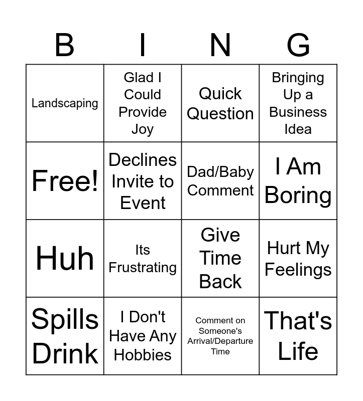 This bingo card has 16 words: I Don't Have Any Hobbies, Hurt My Feelings, Quick Question, Landscaping, Huh, Glad I Could Provide Joy, Give Time Back, Comment on Someone's Arrival/Departure Time, Free!, Declines Invite to Event, Spills Drink, Bringing Up a Business Idea, Its Frustrating, I Am Boring, Dad/Baby Comment and That's Life.