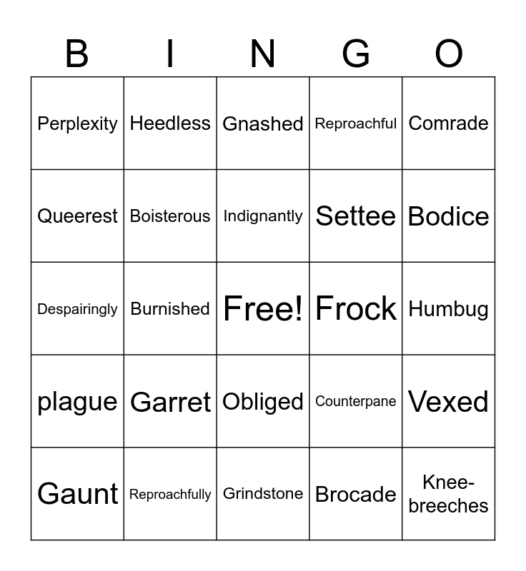 This bingo card has a free space and 24 words: Garret, Reproachfully, Indignantly, Gaunt, Comrade, Perplexity, Queerest, Heedless, Frock, Obliged, Settee, Despairingly, Counterpane, Vexed, Boisterous, Brocade, Humbug, Gnashed, Bodice, Burnished, Knee-breeches, plague, Reproachful and Grindstone.