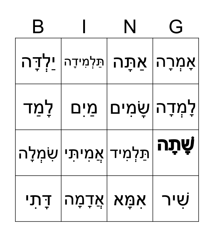 This bingo card has 20 words: דָּתִי, אִישׁ, אַתָּה, שָׁתָה, לִילִי, אֲמִיתִּי, אִמָּא, אָמְרָה, שִׂמְלָה, תַּלְמִידָה, תַּלְמִיד, לָמְדָה, יַלְדָּה, אֲדָמָה, שָׂמִים, שָׁנָה, לָמַד, מַיִם, מַשָּׂאִית and שִׁיר.