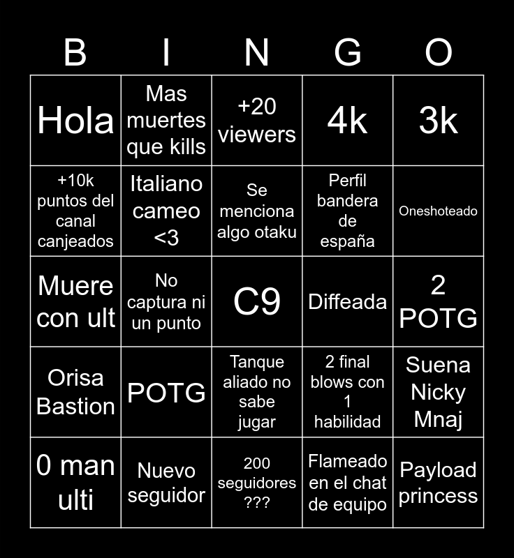 This bingo card has a free space and 24 words: POTG, Nuevo seguidor, Se menciona algo otaku, 0 man ulti, 3k, Hola, +10k puntos del canal canjeados, Mas muertes que kills, Diffeada, Tanque aliado no sabe jugar, Perfil bandera de españa, Muere con ult, 2 final blows con 1 habilidad, Suena Nicky Mnaj, Italiano cameo <3, Flameado en el chat de equipo, 2 POTG, +20 viewers, Oneshoteado, No captura ni un punto, Payload princess, Orisa Bastion, 4k and 200 seguidores ???.