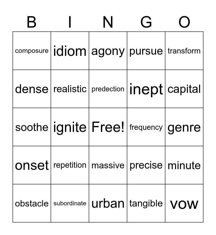 This bingo card has a free space and 24 words: repetition, subordinate, predection, obstacle, transform, composure, dense, idiom, frequency, massive, inept, soothe, precise, minute, realistic, tangible, genre, agony, capital, ignite, vow, onset, pursue and urban.