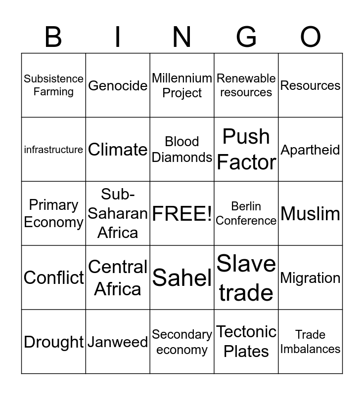 This bingo card has a free space and 33 words: Aids, Victoria Falls, Sub-Saharan Africa, Ethnic Groups, Conflict, Climate, Resources, Drought, Genocide, Climatic Forces, Blood Diamonds, Millennium Project, Child Soldiers, Population Density, Berlin Conference, Apartheid, Janweed, Primary Economy, Central Africa, Slave trade, Sahel, Darfur, Subsistence Farming, Muslim, Secondary economy, Trade Imbalances, Renewable resources, Push Factor, infrastructure, Migration, Animism, Tectonic Plates and Cult.