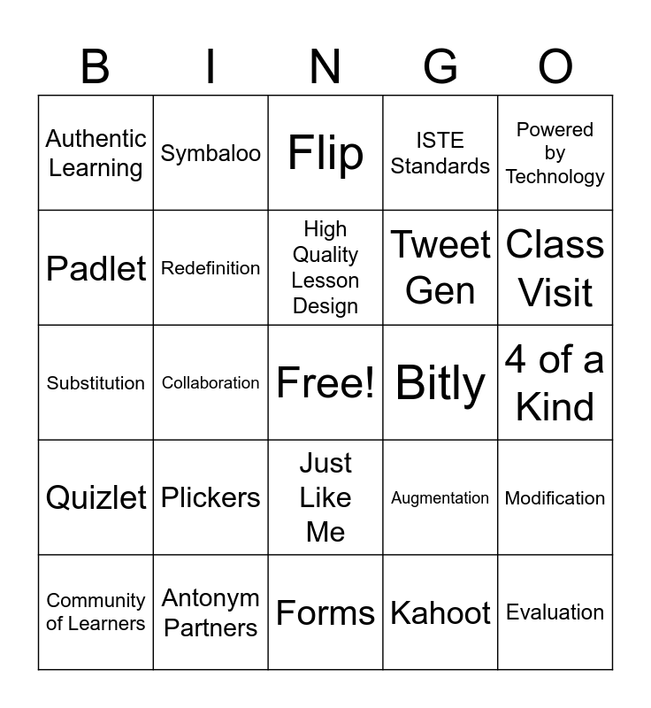This bingo card has a free space and 24 words: Plickers, Antonym Partners, High Quality Lesson Design, Community of Learners, Powered by Technology, Authentic Learning, Padlet, Symbaloo, Bitly, Just Like Me, Tweet Gen, Substitution, Augmentation, Modification, Redefinition, Kahoot, 4 of a Kind, Flip, Class Visit, Collaboration, Evaluation, Quizlet, ISTE Standards and Forms.