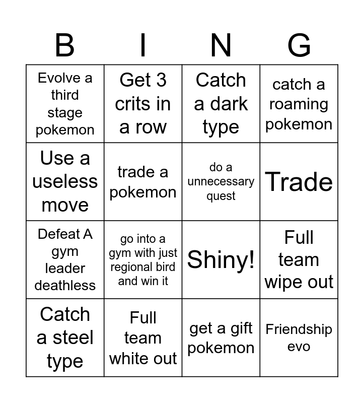 This bingo card has 16 words: Full team white out, Full team wipe out, Catch a dark type, Evolve a third stage pokemon, Defeat A gym leader deathless, Get 3 crits in a row, Shiny!, get a gift pokemon, Use a useless move, trade a pokemon, Catch a steel type, catch a roaming pokemon, go into a gym with just regional bird and win it, Trade, do a unnecessary quest and Friendship evo.