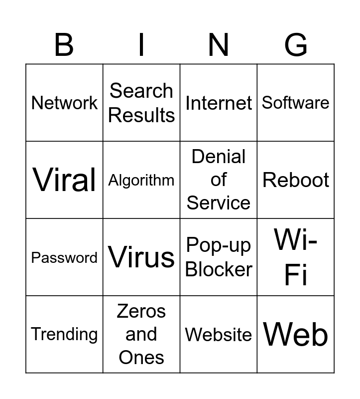 This bingo card has 16 words: Zeros and Ones, Wi-Fi, Internet, Network, Password, Search Results, Pop-up Blocker, Website, Viral, Algorithm, Trending, Software, Virus, Reboot, Denial of Service and Web.