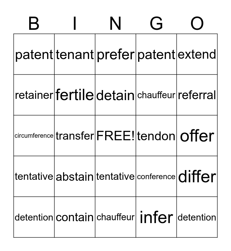 This bingo card has a free space and 24 words: abstain, contain, detain, detention, extend, patent, retainer, tenant, tendon, tentative, chauffeur, circumference, conference, differ, fertile, infer, offer, prefer, referral, transfer, detention, tentative, patent and chauffeur.