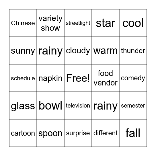 This bingo card has a free space and 75 words: overpass, sidewalk, streetlight, traffic light, careful, street cleaner, telephone booth, curb, different, both ways, lightning, scooters, food vendor, thunder, cold, rainy, crosswalk, rainy, snowy, sunny, foggy, cloudy, warm, cool, Chinese, English, math, art, phsical education, history, classmate, science, music, semester, schedule, variety show, drama, travel show, comedy, cartoon, movie, educational program, actor, actress, singer, remote control, television, star, news, balloon, decoration, surprise, party hat, card, candle, birthday cake, invitation, guest, present, fork, spoon, cup, pepper, sugar, chopsticks, napkin, knife, salt, plate, glass, bowl, spring, summer, fall and winter.