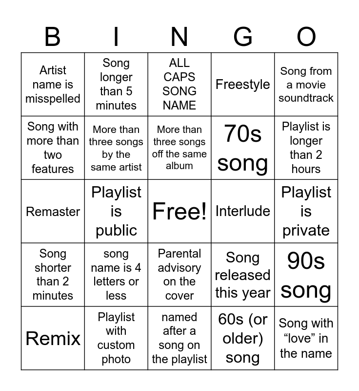 This bingo card has a free space and 28 words: 90s song, 80s song, 70s song, 60s (or older) song, Song with more than two features, ALL CAPS SONG NAME, Song longer than 5 minutes, Song shorter than 2 minutes, Interlude, Remix, Remaster, Freestyle, Playlist with custom photo, named after a song on the playlist, Playlist is longer than 2 hours, Non-english song, song name is 4 letters or less, More than three songs by the same artist, More than three songs off the same album, Parental advisory on the cover, Artist name is misspelled, Playlist has more than 5 saves, Song with “love” in the name, Playlist is public, Playlist is private, Song released this year, Song from a movie soundtrack and all lowercase song name.