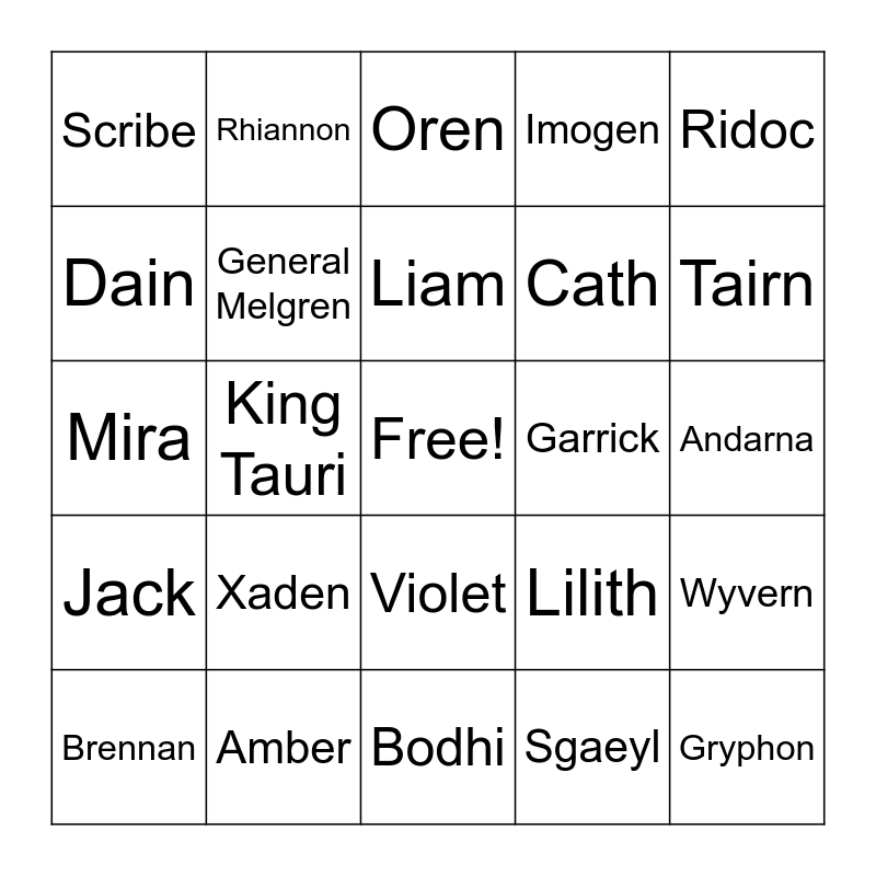 This bingo card has a free space and 24 words: Xaden, Amber, Liam, Brennan, Ridoc, Scribe, Dain, Rhiannon, Garrick, Violet, Cath, Mira, Lilith, Wyvern, General Melgren, Sgaeyl, Andarna, Oren, Tairn, King Tauri, Gryphon, Jack, Imogen and Bodhi.