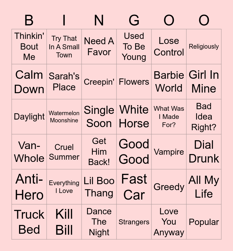 This bingo card has 36 words: Van-Whole, Cruel Summer, Dance The Night, Flowers, What Was I Made For?, Bad Idea Right?, Thinkin' Bout Me, Kill Bill, Need A Favor, Fast Car, Barbie World, Religiously, Anti-Hero, Watermelon Moonshine, Creepin', Used To Be Young, Greedy, Dial Drunk, Calm Down, Sarah's Place, Get Him Back!, Good Good, Vampire, All My Life, Daylight, Try That In A Small Town, Single Soon, Strangers, Lose Control, Girl In Mine, Truck Bed, Everything I Love, Lil Boo Thang, White Horse, Love You Anyway and Popular.