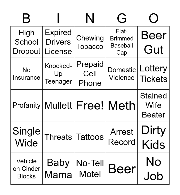This bingo card has a free space and 24 words: Threats, Baby Mama, Prepaid Cell Phone, Vehicle on Cinder Blocks, Beer Gut, High School Dropout, No Insurance, Expired Drivers License, Meth, Tattoos, Domestic Violence, Profanity, Arrest Record, Dirty Kids, Knocked-Up Teenager, Beer, Stained Wife Beater, Chewing Tobacco, Lottery Tickets, Mullett, No Job, Single Wide, Flat-Brimmed Baseball Cap and No-Tell Motel.