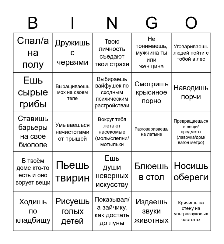 This bingo card has a free space and 24 words: Пьешь твирин, Рисуешь голых детей, Выбираешь вайфушек по сходным психическим растройстваи, Ходишь по кладбищу, Уговариваешь людей пойти с тобой в лес, Спал/а на полу, Ешь сырые грибы, Дружишь с червями, Разговариваешь на латыне, Ешь души неверных искусству, Смотришь крысиное порно, Ставишь барьеры на свое биополе, Блюешь в стол, Носишь обереги, Выращиваешь мох на своем теле, Издаешь звуки животных, Превращаешься в вещи/предметы (лавочка/дом/вагон метро), Твою личность съедают твои страхи, Наводишь порчи, Умываешься нечистотами от прыщей, Кричишь на стену на ультразвуковых частотах, В твоём доме кто-то есть и оно ворует вещи, Не понимаешь, мужчина ты или женщина and Показывал/а зайчику, как достать до луны.