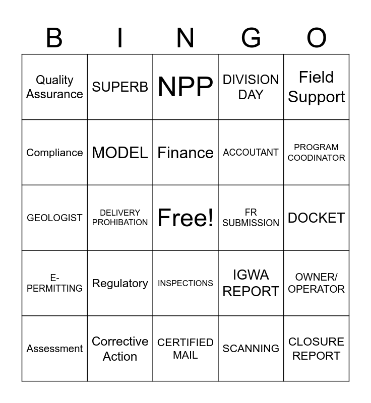 This bingo card has a free space and 24 words: Regulatory, Corrective Action, Finance, Assessment, Field Support, Quality Assurance, Compliance, SUPERB, FR SUBMISSION, INSPECTIONS, ACCOUTANT, GEOLOGIST, IGWA REPORT, OWNER/ OPERATOR, MODEL, SCANNING, DOCKET, NPP, PROGRAM COODINATOR, DELIVERY PROHIBATION, CLOSURE REPORT, E-PERMITTING, DIVISION DAY and CERTIFIED MAIL.