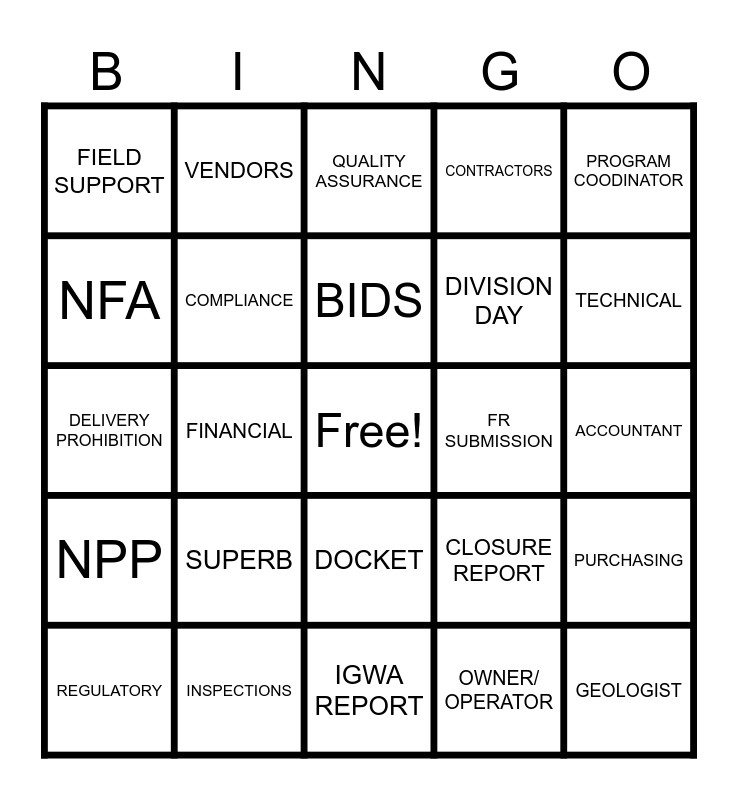 This bingo card has a free space and 29 words: REGULATORY, CORRECTIVE ACTION, FINANCIAL, ASSESSMENT, FIELD SUPPORT, QUALITY ASSURANCE, COMPLIANCE, SUPERB, FR SUBMISSION, INSPECTIONS, ACCOUNTANT, GEOLOGIST, IGWA REPORT, OWNER/ OPERATOR, TECHNICAL, SCANNING, DOCKET, NPP, PROGRAM COODINATOR, DELIVERY PROHIBITION, CLOSURE REPORT, E-PERMITTING, DIVISION DAY, NFA, CONTRACTORS, VENDORS, PURCHASING, BIDS and TRAVEL.