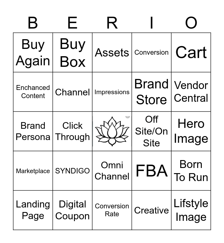 This bingo card has a free space and 31 words: Conversion Rate, Content, Click Through, ROAS, Buy Again, Assets, Channel, FBA, Off Site/On Site, Creative, Hero Image, Lifstyle Image, Digital Remarketing, Campaign, Vendor Central, Always On Search, Born To Run, SYNDIGO, Marketplace, Omni Channel, Cart, Banner Ad, Landing Page, Buy Box, Brand Store, Enchanced Content, Conversion, Brand Persona, Digital Coupon, Impressions and Catalog.