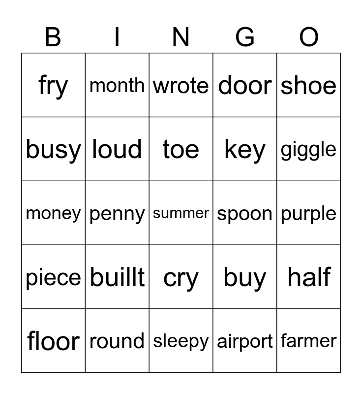 This bingo card has 30 words: round, knee, penny, tight, fry, wrote, loud, cry, spoon, sleepy, purple, summer, airport, farmer, giggle, build, buy, piece, buillt, shoe, money, hour, month, key, busy, door, half, floor, toe and eight.
