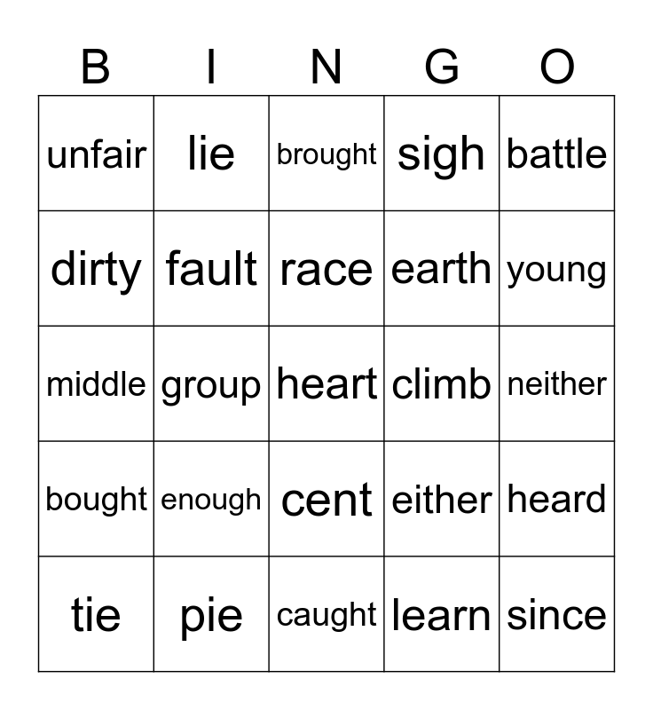 This bingo card has 35 words: dry, paw, point, fault, cent, sigh, dirty, mouth, race, joy, middle, battle, bedroom, winter, unfair, climb, learn, group, bought, heart, either, tie, heard, pie, brought, young, since, through, earth, neither, early, caught, enough, lie and thought.