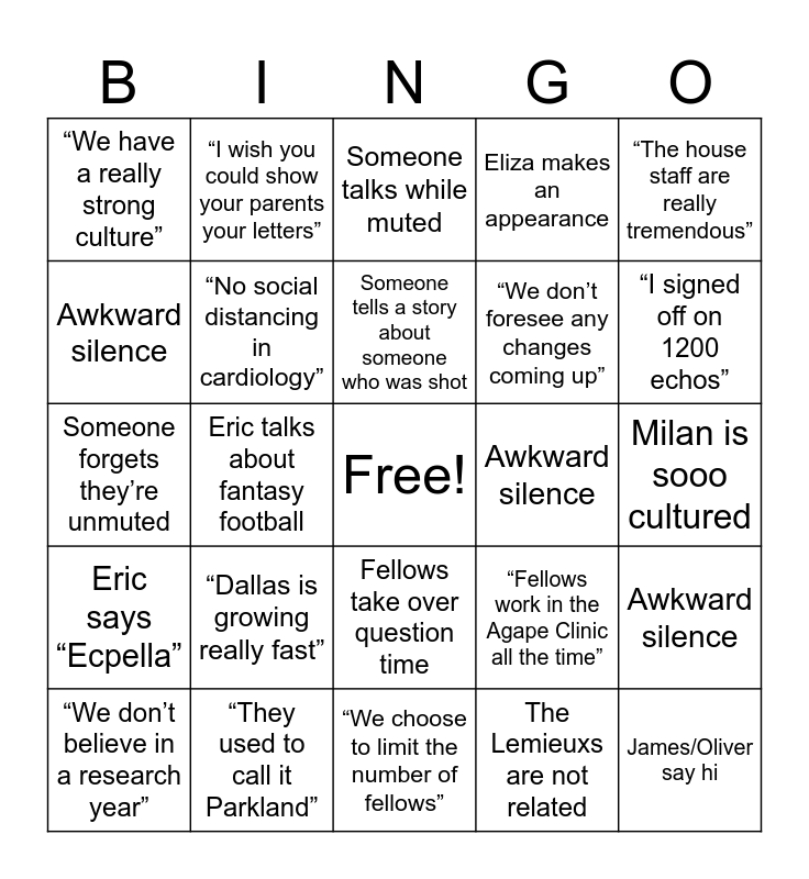 This bingo card has a free space and 38 words: “Call isn’t that bad”, Eric = cardiology girl, “I want to evenly distribute call”, “No social distancing in cardiology”, Awkward silence, “Dallas is growing really fast”, Someone tells a story about someone who was shot, “I read 70 echos yesterday”, “The house staff are really tremendous”, “We don’t foresee any changes coming up”, Eric talks about fantasy football, Eliza makes an appearance, James/Oliver say hi, Milan is sooo cultured, Awkward silence, Eric says “Ecpella”, Katy Kopecky is mentioned 3 times, Someone talks while muted, Video glitches, Awkward silence, “We have a really strong culture”, “They used to call it Parkland”, “I signed off on 1200 echos”, “We don’t believe in a research year”, Someone’s video freezes while driving, “We choose to limit the number of fellows”, “Dallas has restaurants”, “Priscilla will cut you off”, Ariane is outside, Ria makes an appearance, Applicant asks if we hang out, Fellows take over question time, The Lemieuxs are not related, “I wish you could show your parents your letters”, “We call it BUMC”, “Fellows work in the Agape Clinic all the time”, Someone forgets they’re unmuted and Patrick’s dog is a good.