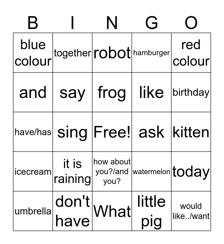 This bingo card has a free space and 24 words: it is raining, don't have, frog, umbrella, red colour, blue colour, and, together, ask, how about you?/and you?, like, have/has, watermelon, today, say, little pig, kitten, robot, birthday, sing, would like../want, icecream, hamburger and What.