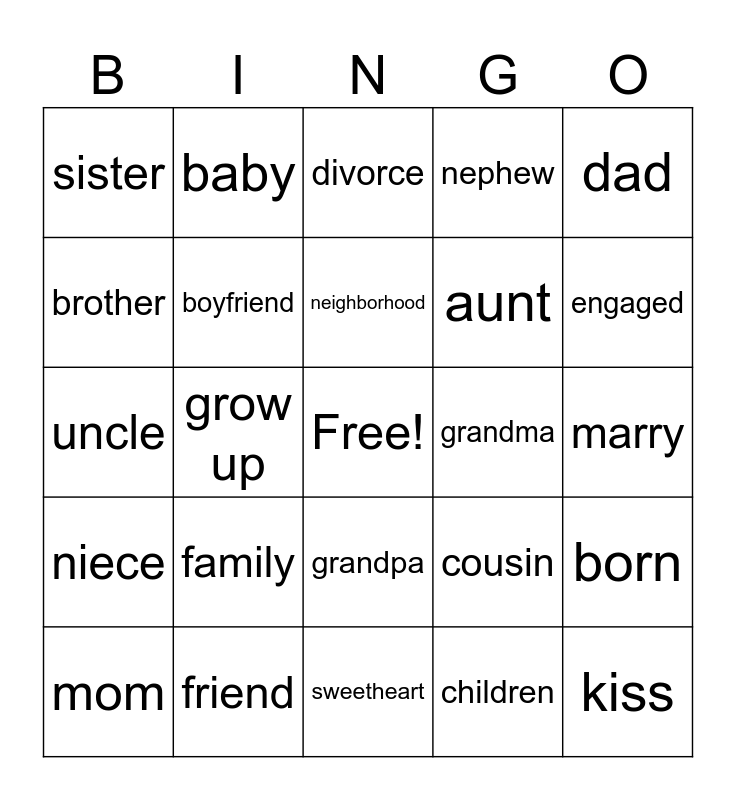 This bingo card has a free space and 24 words: family, friend, neighborhood, mom, dad, sister, brother, baby, grandma, grandpa, aunt, uncle, cousin, born, boyfriend, children, marry, divorce, engaged, grow up, kiss, niece, nephew and sweetheart.