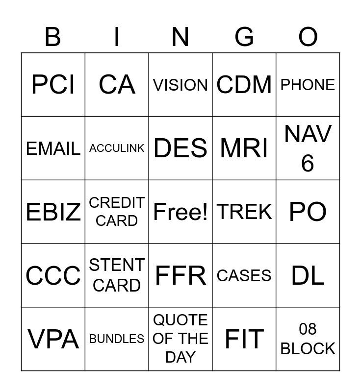 This bingo card has a free space and 65 words: GTS, CRM, ECC, DL, ST, AC, CA, VC, DES, WR, FFR, ACCOUNT NUMBER, PO, PHONE, FAX, EMAIL, CREDIT CARD, PCI, PRICE, MRI, STENT CARD, CCC, CDM, PLS, SS, SPS, RETURNS, CREDIT, 08 BLOCK, INTERCOMPANY, VPA, PAP, 210, P3, CASES, BUNDLES, ALA CART, EBIZ, FIT, XACT, ACCULINK, PROGLIDE, TREK, WIGGLE, DRAGONFLY, SUPERA, NAV 6, SIERRA, ALPINE, RX, OTW, CONNIE, LET'S TAKE THIS OUTSIDE, QUOTE OF THE DAY, ARMADA, COPILOT, SKYPOINT, VISION, BMS, 4PM, 5PM-5AM, IRB, CAPITAL, JLU VS CONNIE and CONNIE VS JLU.