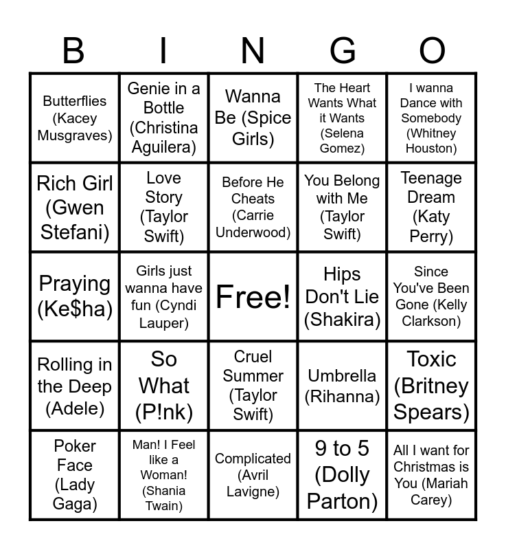 This bingo card has a free space and 29 words: Say my name (Destiny's Child), Man! I Feel like a Woman! (Shania Twain), Wanna Be (Spice Girls), Flowers (Miley Cyrus), I wanna Dance with Somebody (Whitney Houston), Butterflies (Kacey Musgraves), Love Story (Taylor Swift), Before He Cheats (Carrie Underwood), Hips Don't Lie (Shakira), Toxic (Britney Spears), Poker Face (Lady Gaga), Girls just wanna have fun (Cyndi Lauper), 9 to 5 (Dolly Parton), All I want for Christmas is You (Mariah Carey), Praying (Ke$ha), Jolene (Dolly Parton), Complicated (Avril Lavigne), Umbrella (Rihanna), Teenage Dream (Katy Perry), Rolling in the Deep (Adele), So What (P!nk), Crazy in Love (Beyonce), You Belong with Me (Taylor Swift), Since You've Been Gone (Kelly Clarkson), Rich Girl (Gwen Stefani), Genie in a Bottle (Christina Aguilera), Cruel Summer (Taylor Swift), The Heart Wants What it Wants (Selena Gomez) and Hopelessly Devoted To You (Olivia Newton John).