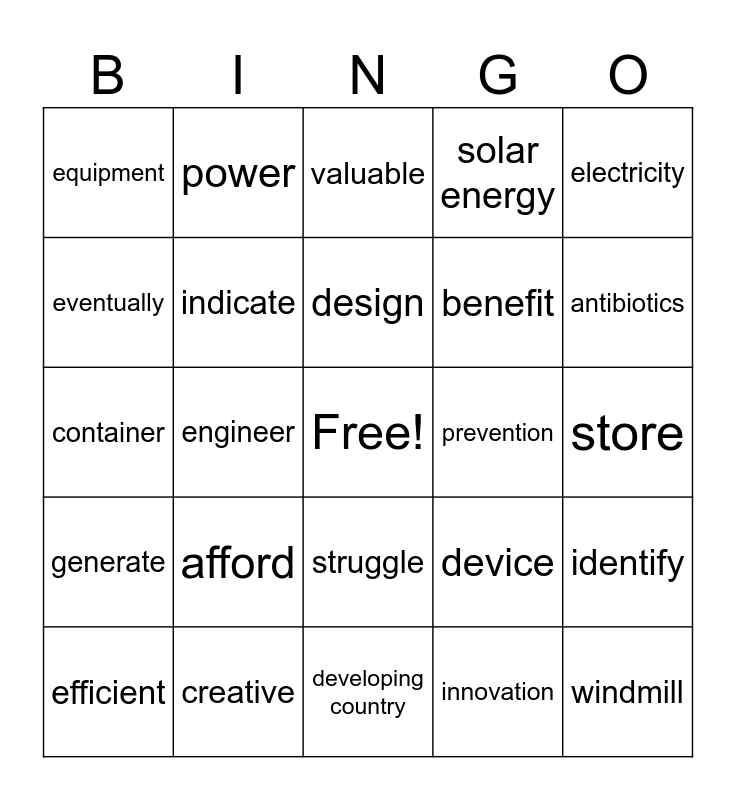 This bingo card has a free space and 24 words: afford, creative, design, efficient, electricity, equipment, eventually, power, prevention, struggle, benefit, container, device, identify, indicate, innovation, store, valuable, antibiotics, engineer, windmill, generate, solar energy and developing country.