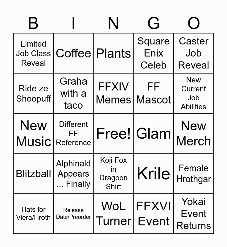 This bingo card has a free space and 29 words: Hildebranc Quests, Release Date/Preorder, Plants, Graphics Update, Caster Job Reveal, Limited Job Class Reveal, Graha with a taco, FFXIV Memes, Glam, Female Hrothgar, Hats for Viera/Hroth, Different FF Reference, FFXVI Event, Yokai Event Returns, New Music, New Causal Content, WoL Turner, Krile, New Current Job Abilities, Blitzball, Alphinald Appears ... Finally, Asura Battle, FF Mascot, New Merch, Ride ze Shoopuff, Coffee, Koji Fox in Dragoon Shirt, Square Enix Celeb and FFVII Rebirth Event.