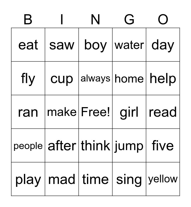 This bingo card has a free space and 24 words: after, mad, always, play, day, eat, fly, saw, girl, think, home, ran, jump, five, cup, sing, read, boy, help, make, yellow, people, water and time.