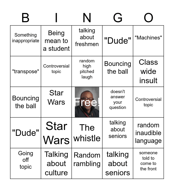 This bingo card has a free space and 56 words: Class wide insult, Going off topic, Some weird catchphrase, Something inappropriate, Random rambling, Randomly mad at us, Controversial topic, "transpose", Bouncing the ball, Random poor grade, "Dude", Being mean to a student, The whistle, Something about capitalism, Kicking someone out, Trying to play off mistake, "Machines", Star Wars, Talking about culture, someone told to come to the front, doesn't answer your question, "Right [name]?", talking about seniors, talking about freshmen, "nomsain", random high pitched laugh, random inaudible language, saying something stupid/wrong, Class wide insult, Going off topic, Some weird catchphrase, Something inappropriate, Random rambling, Randomly mad at us, Controversial topic, "transpose", Bouncing the ball, Random poor grade, "Dude", Being mean to a student, The whistle, Something about capitalism, Kicking someone out, Trying to play off mistake, "Machines", Star Wars, Talking about culture, someone told to come to the front, doesn't answer your question, "Right [name]?", talking about seniors, talking about freshmen, "nomsain", random high pitched laugh, random inaudible language and saying something stupid/wrong.