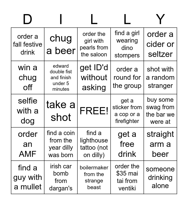 This bingo card has a free space and 24 words: find a coin from the year dilly was born, irish car bomb from dargan's, get ID'd without asking, find a guy with a mullet, order a cider or seltzer, order a fall festive drink, win a chug off, chug a beer, get a sticker from a cop or a firefighter, find a lighthouse tattoo (not on dilly), order a round for the group, selfie with a dog, get a free drink, straight arm a beer, edward double fist and finish under 5 minutes, order the $35 mai tai from ventiki, buy some swag from the bar we were at, order the girl with pearls from the saloon, shot with a random stranger, take a shot, someone drinking alone, order an AMF, find a girl wearing dino stompers and boilermaker from the strange beast.