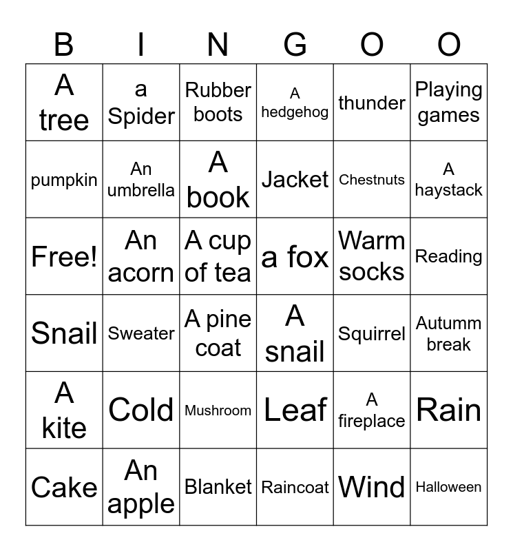 This bingo card has 36 words: Leaf, Mushroom, Raincoat, pumpkin, Snail, a fox, An umbrella, Blanket, thunder, A fireplace, A haystack, A hedgehog, Rain, An acorn, Jacket, A tree, A kite, Warm socks, Free!, Rubber boots, A cup of tea, Sweater, A snail, A pine coat, Squirrel, a Spider, Chestnuts, An apple, A book, Playing games, Halloween, Cake, Autumm break, Reading, Cold and Wind.