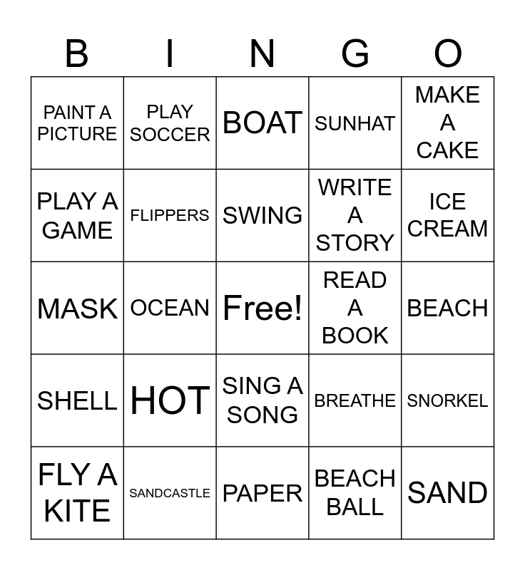 This bingo card has a free space and 25 words: HOT, PAPER, SWING, FLY A KITE, MAKE A CAKE, PAINT A PICTURE, PLAY A GAME, PLAY SOCCER, READ A BOOK, SING A SONG, WRITE A STORY, MASK, BREATHE, SNORKEL, FLIPPERS, BEACH, BEACH, BOAT, ICE CREAM, OCEAN, SAND, SANDCASTLE, SHELL, SUNHAT and BEACH BALL.