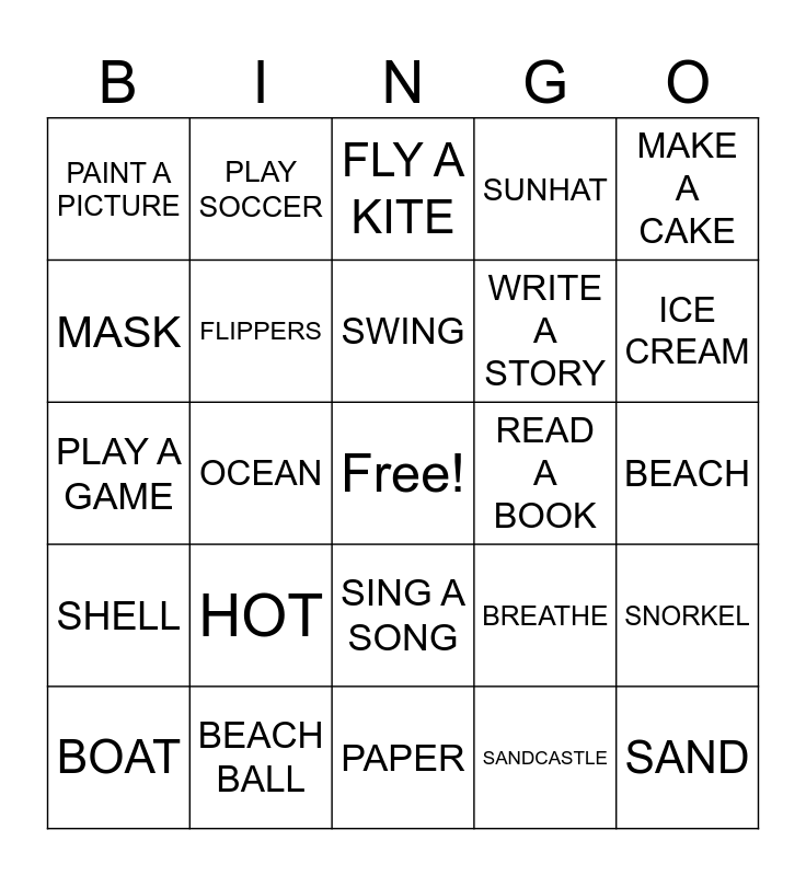 This bingo card has a free space and 25 words: HOT, PAPER, SWING, BOAT, MAKE A CAKE, PAINT A PICTURE, MASK, PLAY SOCCER, READ A BOOK, SING A SONG, WRITE A STORY, PLAY A GAME, BREATHE, SNORKEL, FLIPPERS, BEACH, BEACH, FLY A KITE, ICE CREAM, OCEAN, SAND, BEACH BALL, SHELL, SUNHAT and SANDCASTLE.