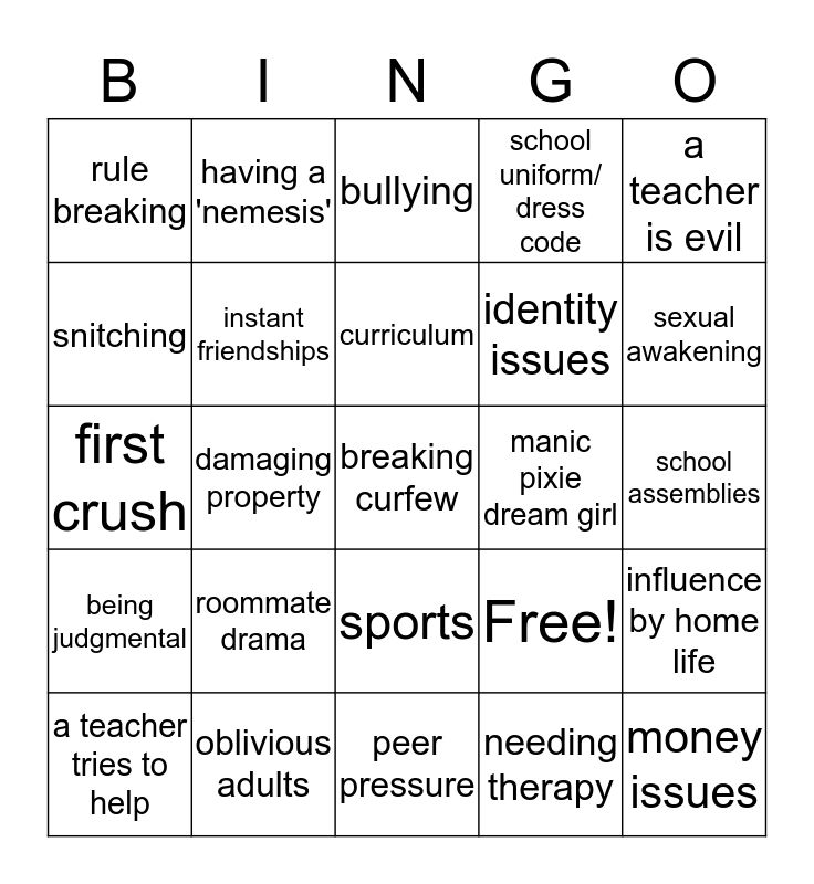 This bingo card has 25 words: roommate drama, peer pressure, curriculum, a teacher tries to help, a teacher is evil, rule breaking, snitching, having a 'nemesis', manic pixie dream girl, sports, identity issues, first crush, Free!, influence by home life, instant friendships, money issues, school assemblies, bullying, sexual awakening, damaging property, breaking curfew, oblivious adults, being judgmental, school uniform/ dress code and needing therapy.