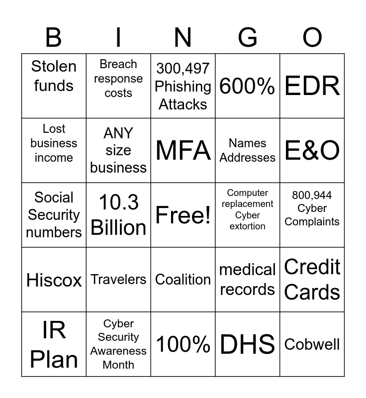 This bingo card has a free space and 24 words: Travelers, Cyber Security Awareness Month, MFA, IR Plan, EDR, Stolen funds, Lost business income, Breach response costs, Computer replacement Cyber extortion, Coalition, Names Addresses, Social Security numbers, medical records, Credit Cards, ANY size business, DHS, 800,944 Cyber Complaints, 300,497 Phishing Attacks, E&O, 10.3 Billion, Cobwell, Hiscox, 600% and 100%.