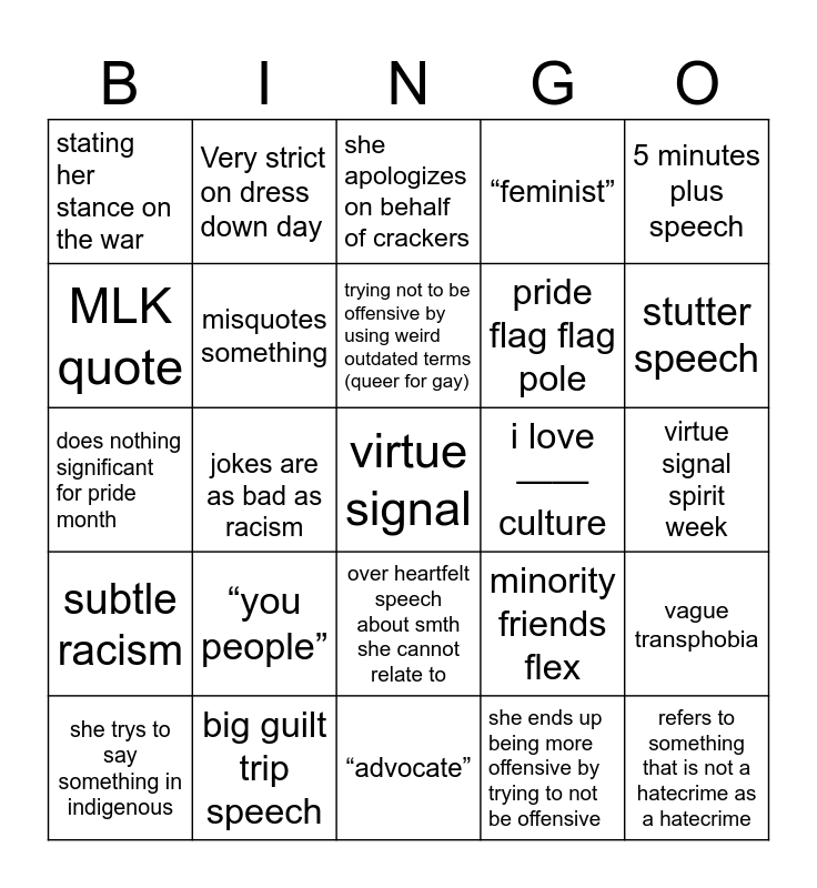 This bingo card has a free space and 26 words: over heartfelt speech about smth she cannot relate to, she ends up being more offensive by trying to not be offensive, trying not to be offensive by using weird outdated terms (queer for gay), big guilt trip speech, 5 minutes plus speech, stating her stance on the war, MLK quote, Very strict on dress down day, virtue signal spirit week, minority friends flex, pride flag flag pole, does nothing significant for pride month, vague transphobia, she trys to say something in indigenous, jokes are as bad as racism, “women traditional”, “feminist”, subtle racism, she apologizes on behalf of crackers, refers to something that is not a hatecrime as a hatecrime, stutter speech, “advocate”, i love —— culture, “you people”, misquotes something and disgusted by something.