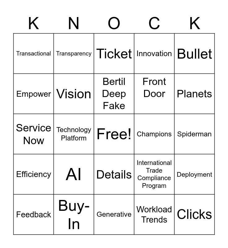 This bingo card has a free space and 24 words: AI, Buy-In, Bertil Deep Fake, Feedback, Bullet, Transactional, Empower, Transparency, Champions, Details, Front Door, Service Now, International Trade Compliance Program, Deployment, Vision, Workload Trends, Spiderman, Ticket, Planets, Technology Platform, Clicks, Efficiency, Innovation and Generative.