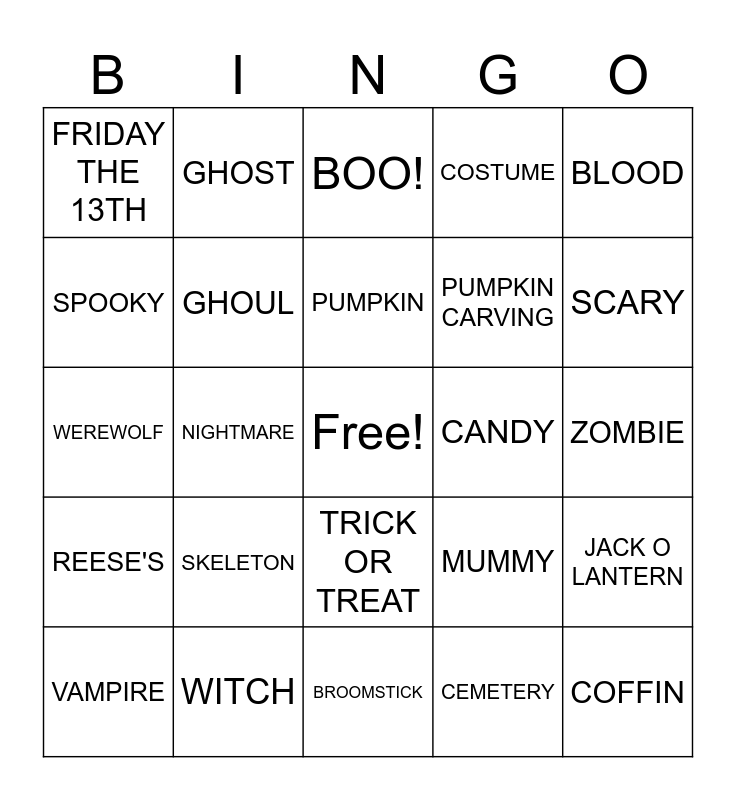 This bingo card has a free space and 24 words: SKELETON, WITCH, PUMPKIN, VAMPIRE, BLOOD, FRIDAY THE 13TH, SPOOKY, GHOST, CANDY, TRICK OR TREAT, PUMPKIN CARVING, WEREWOLF, MUMMY, JACK O LANTERN, GHOUL, CEMETERY, ZOMBIE, BOO!, SCARY, NIGHTMARE, COFFIN, REESE'S, COSTUME and BROOMSTICK.