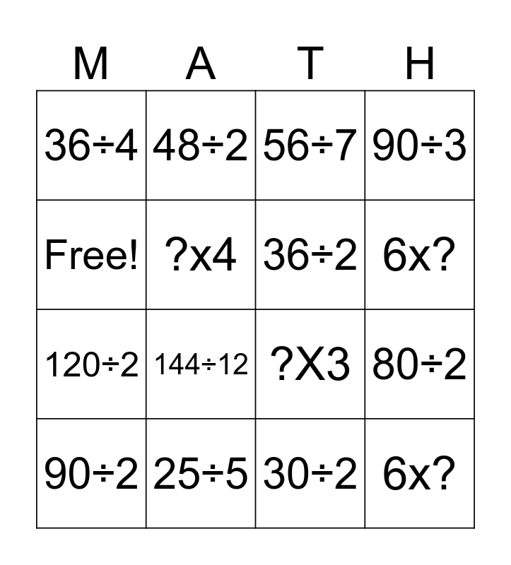 This bingo card has 16 words: 25÷5, 80÷2, 56÷7, 36÷4, 120÷2, 48÷2, ?X3, 30÷2, Free!, ?x4, 90÷2, 90÷3, 144÷12, 6x?, 36÷2 and 6x?.