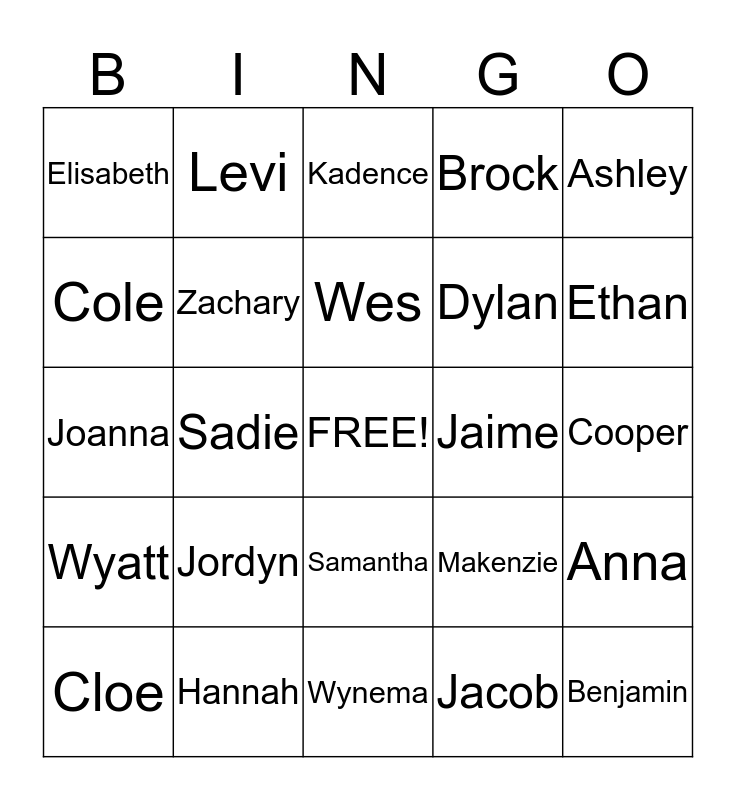 This bingo card has a free space and 24 words: Jordyn, Hannah, Wes, Cloe, Ashley, Elisabeth, Cole, Levi, Jaime, Samantha, Dylan, Joanna, Makenzie, Anna, Zachary, Jacob, Cooper, Kadence, Ethan, Sadie, Benjamin, Wyatt, Brock and Wynema.